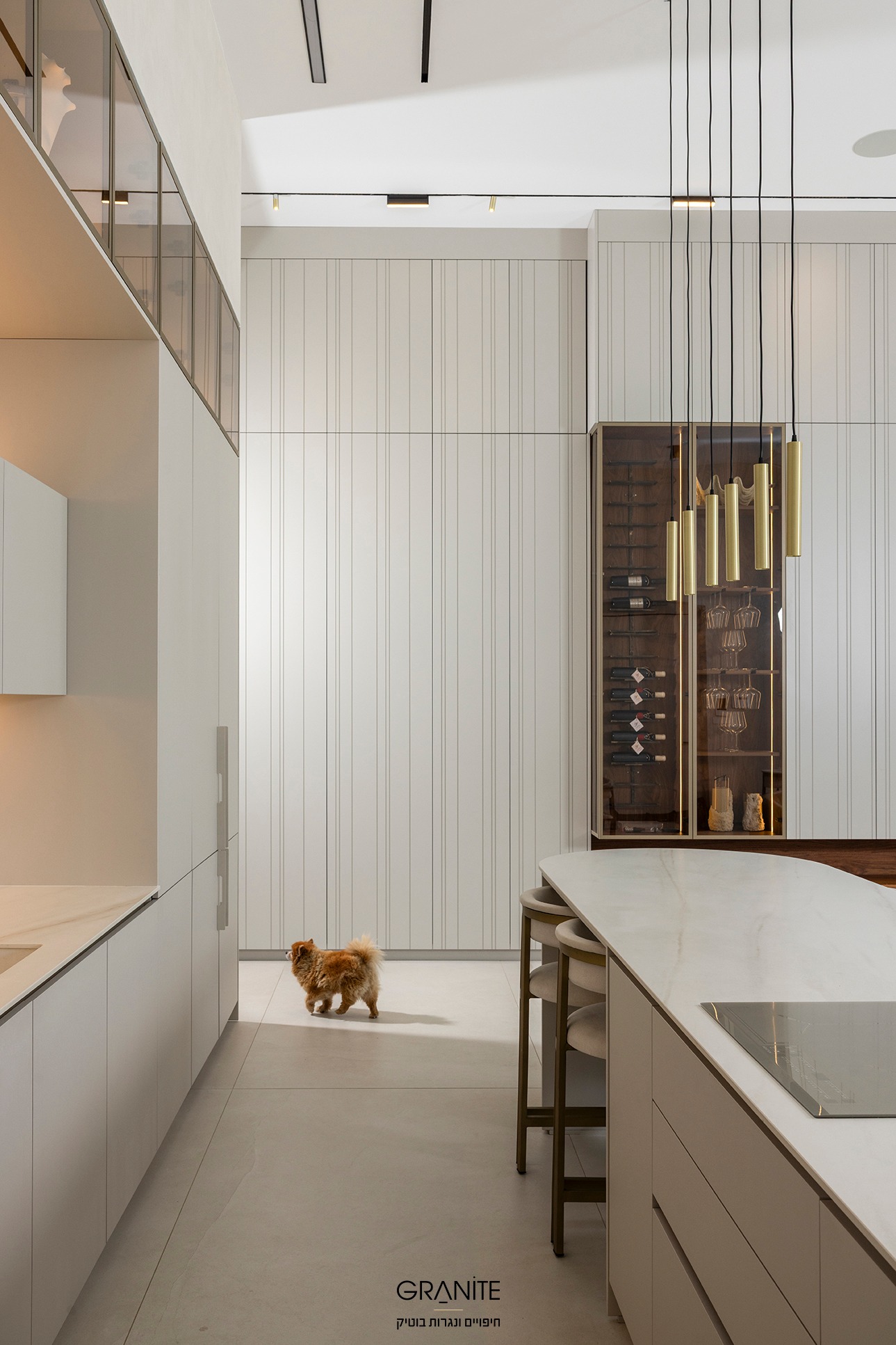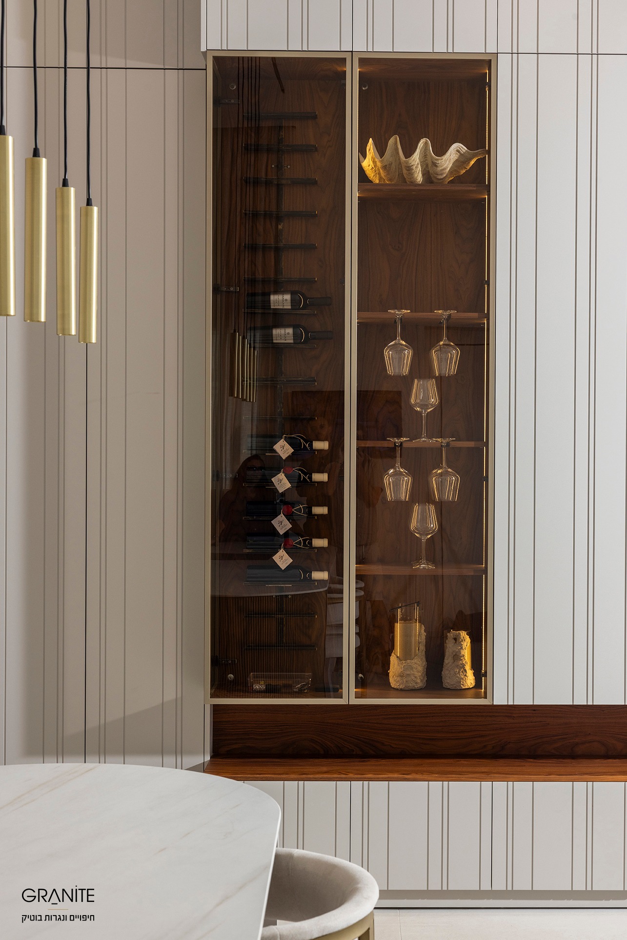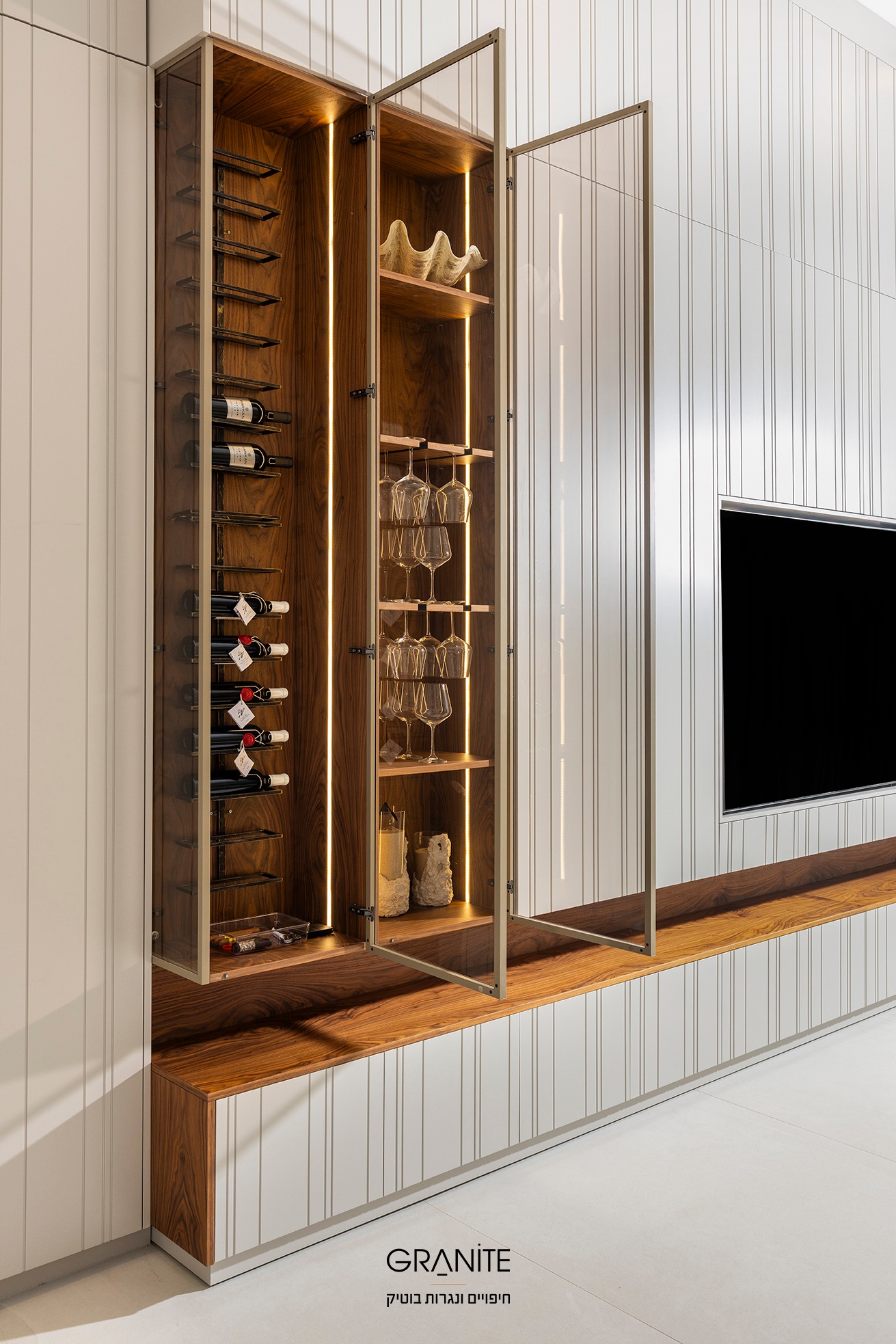 לצד כל אלה, שולבו מידוף אלגנטי לכוסות יין שתוכנן בקפידה ובוצע בחירוץ מיוחד במכונת CNC, יחד עם מעמד ייחודי ליינות פריטים פונקציונליים שמוסיפים נופך יוקרתי לחלל.