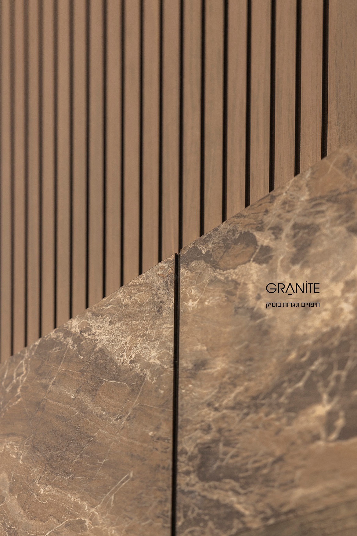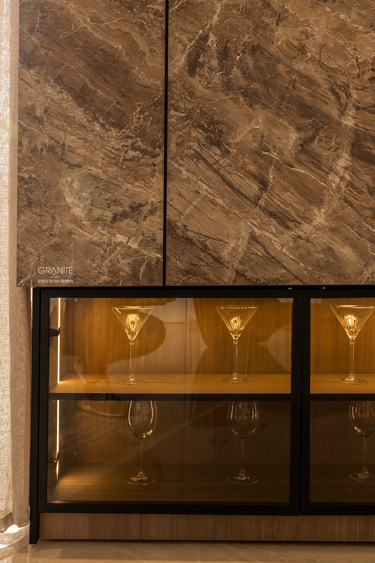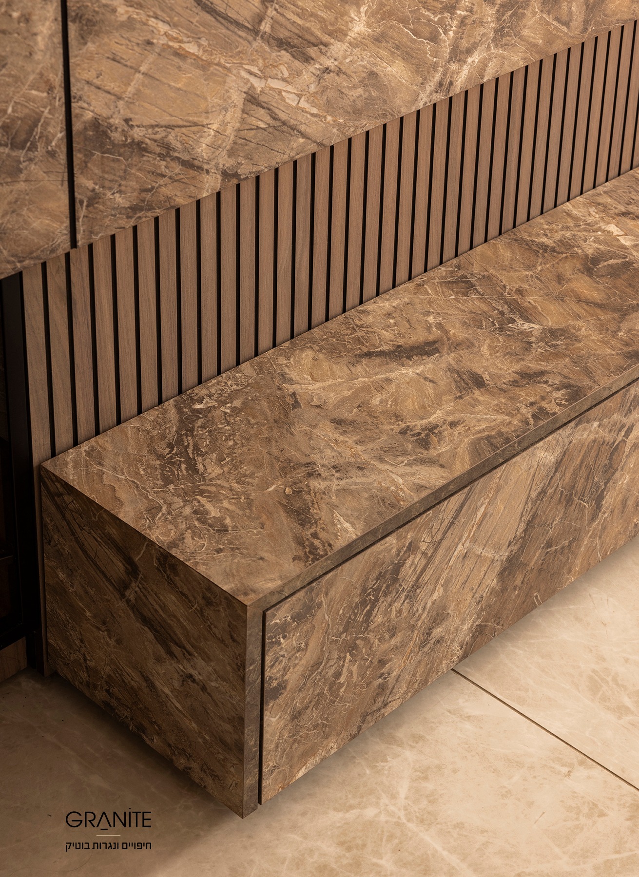 החיפויים בוצעו בשילוב פורמייקה אגוז אמריקאי, יחד עם פלטה מרחפת בחיפוי פורמייקה דמוי שיש,דגם ג’ובאני של חברת טוויזרס.