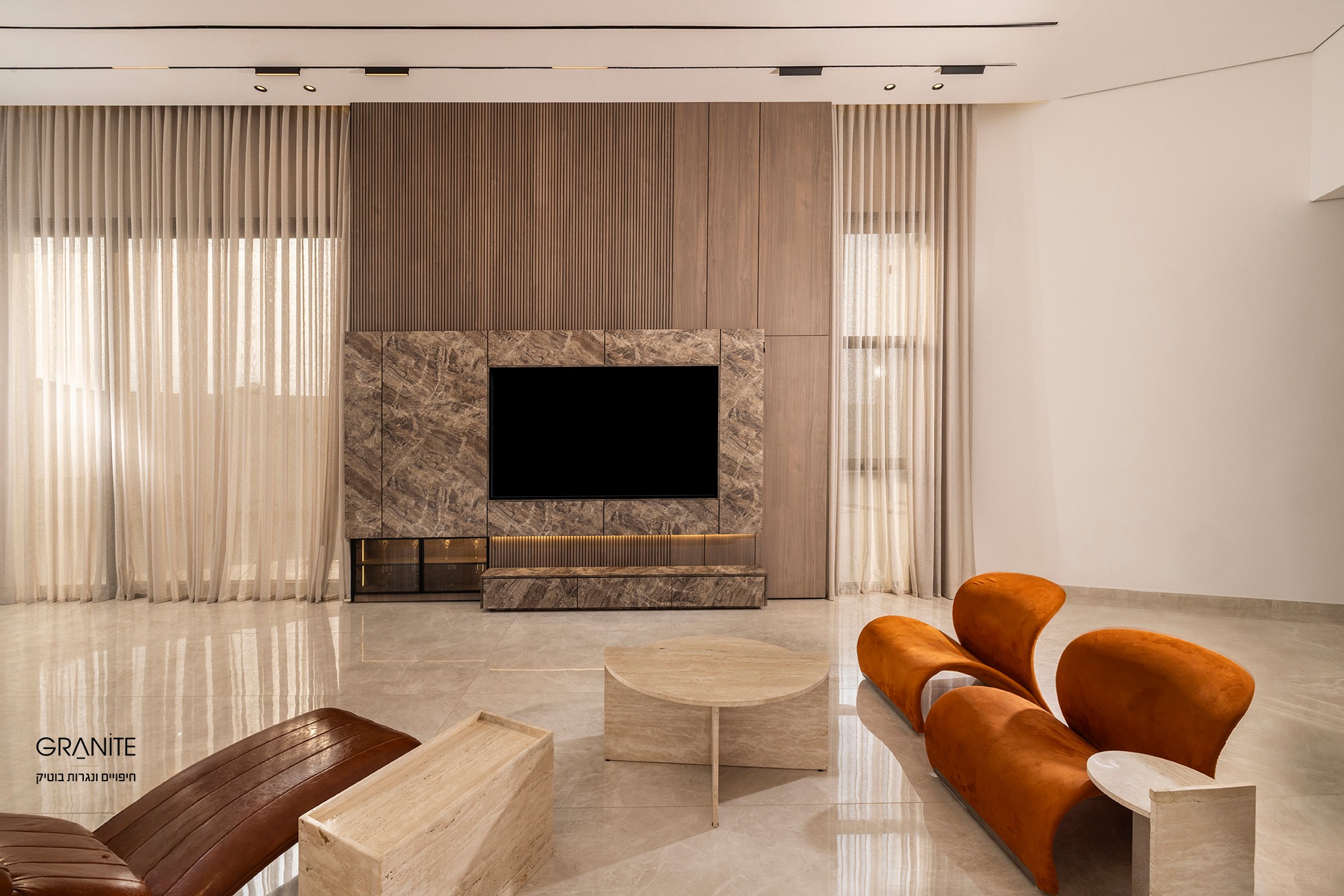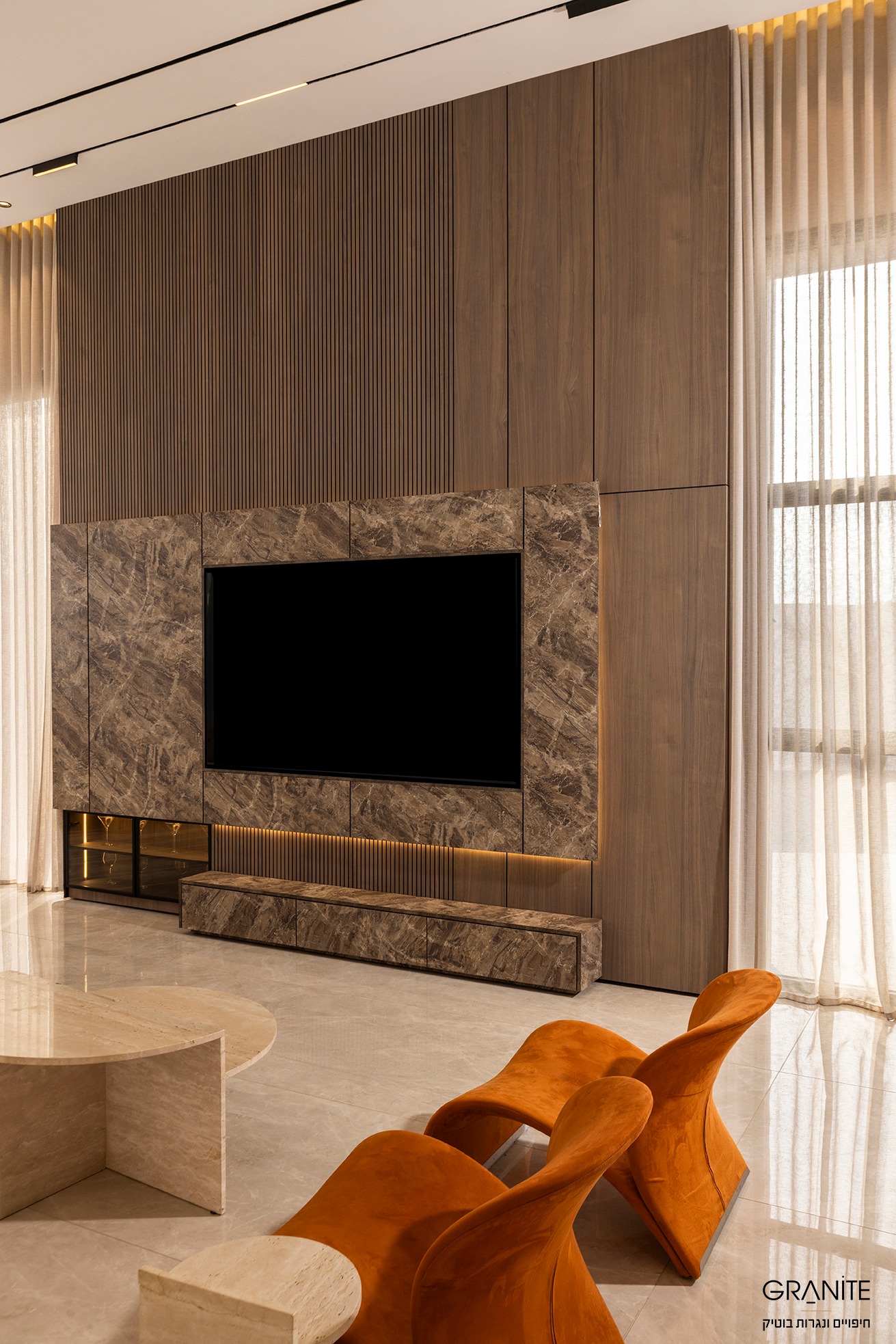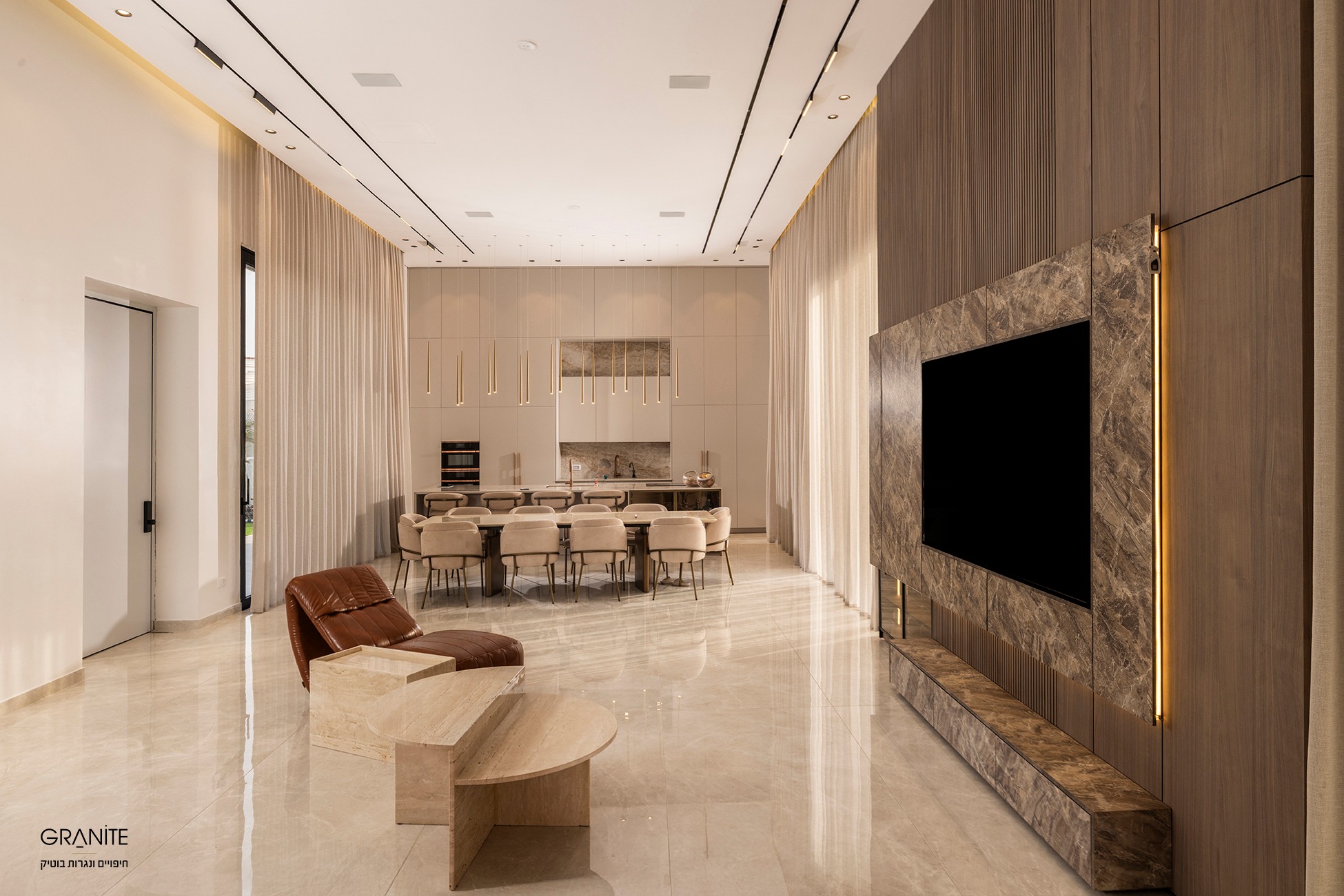אזור הטלוויזיה תוכנן עם נישה בקו אפס ותאורת LED היקפית בגוון 3000K, היוצרת אור רך ומאוזן.